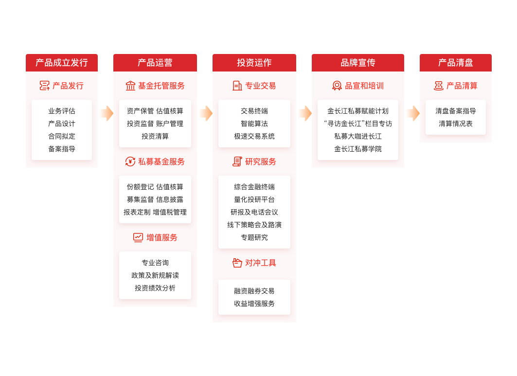 - 長江證券作為經中國基金業協會首批備案的私募基金服務機構(備案編號:A00022),接受資產管理機構的委托,為其提供產品份額登記、估值核算等運營服務,降低運營成本、提高運作效率,使資產管理機構得以投入更多時間與精力專注于核心價值的輸出。